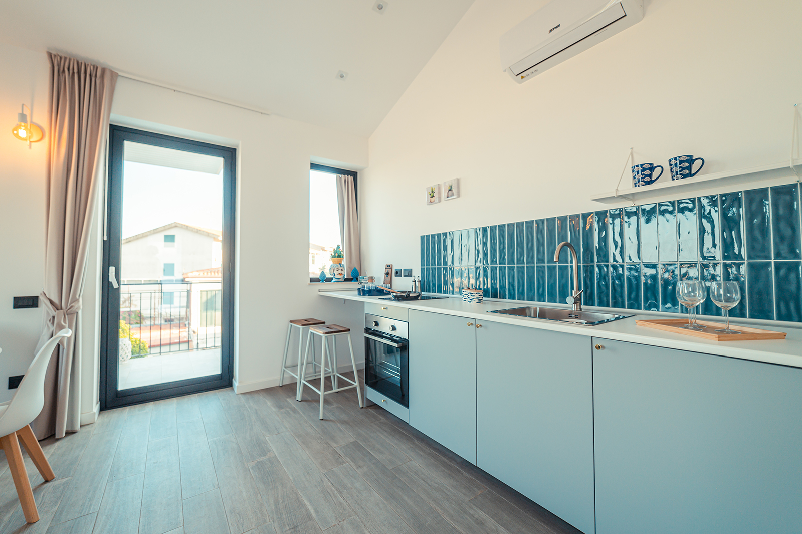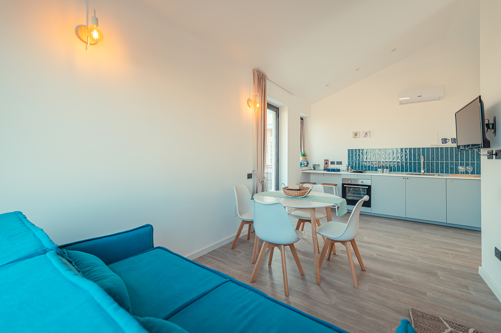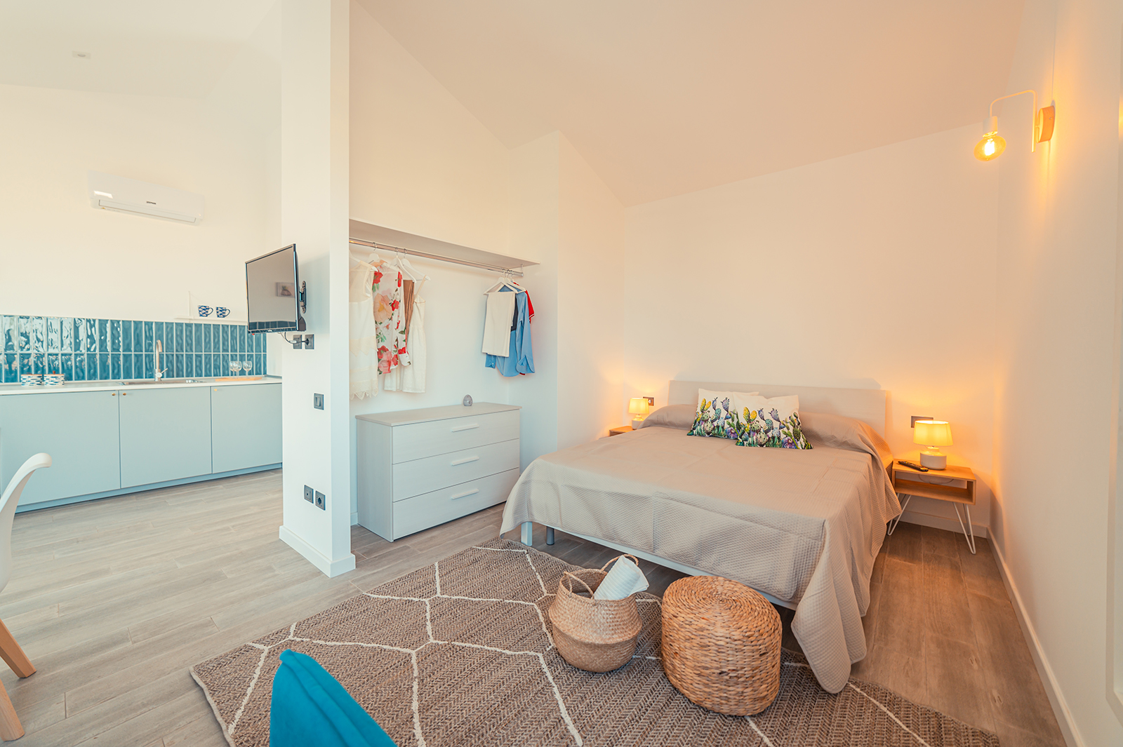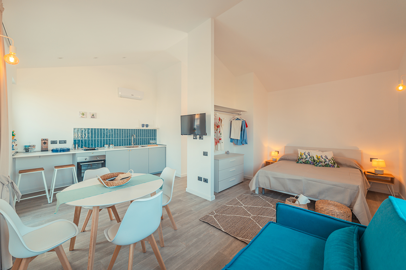 La cucina è dotata di piastre ad induzione e macchina del caffè, presente un letto matrimoniale e un divano letto che permettono di ospitare fino a quattro persone.